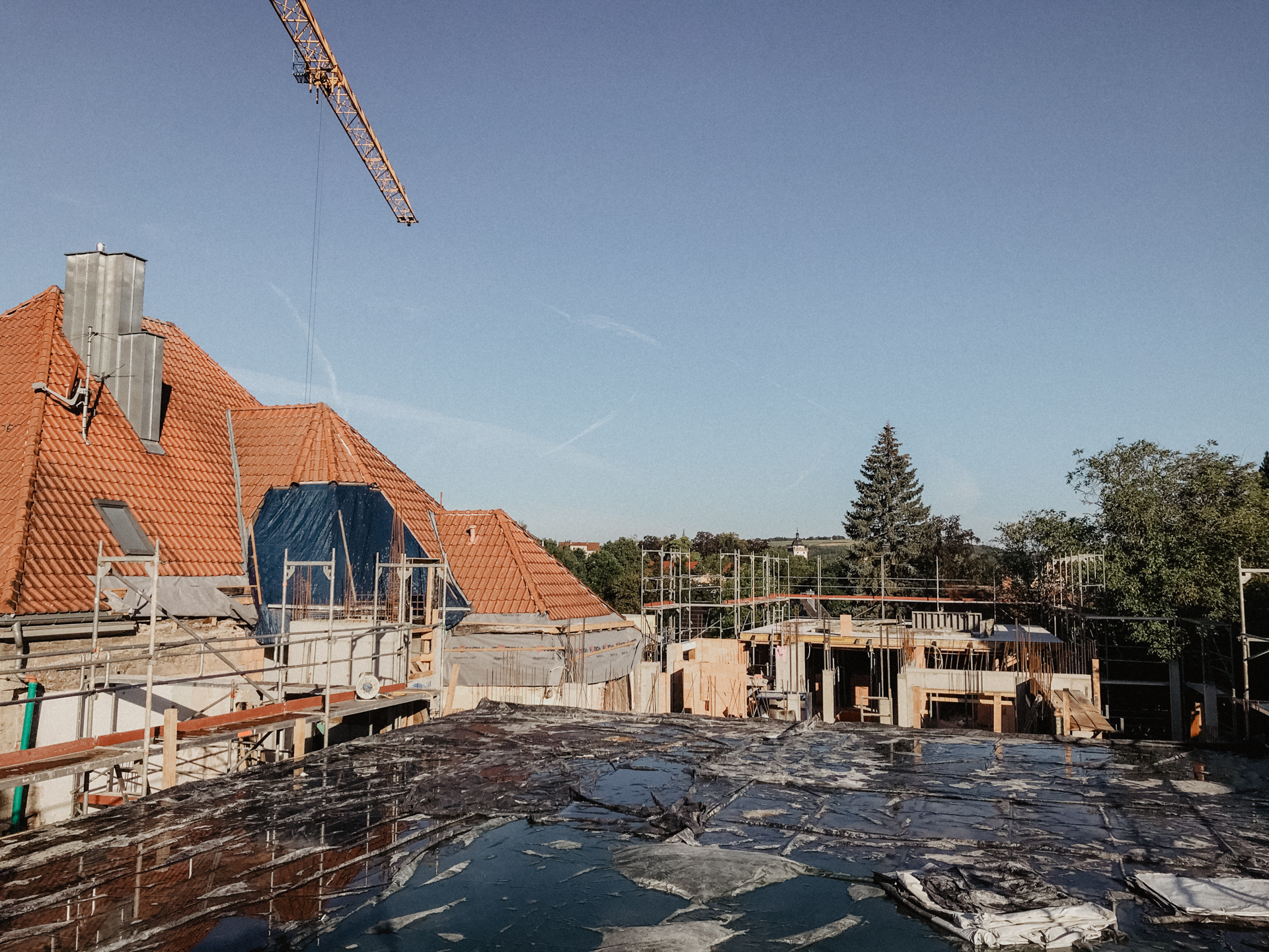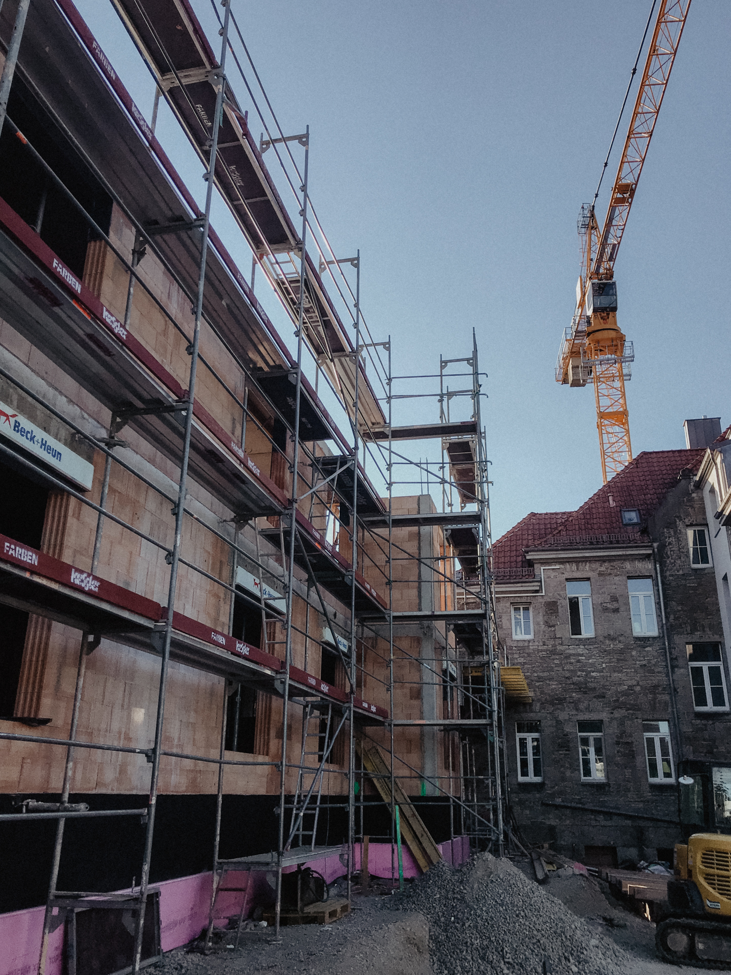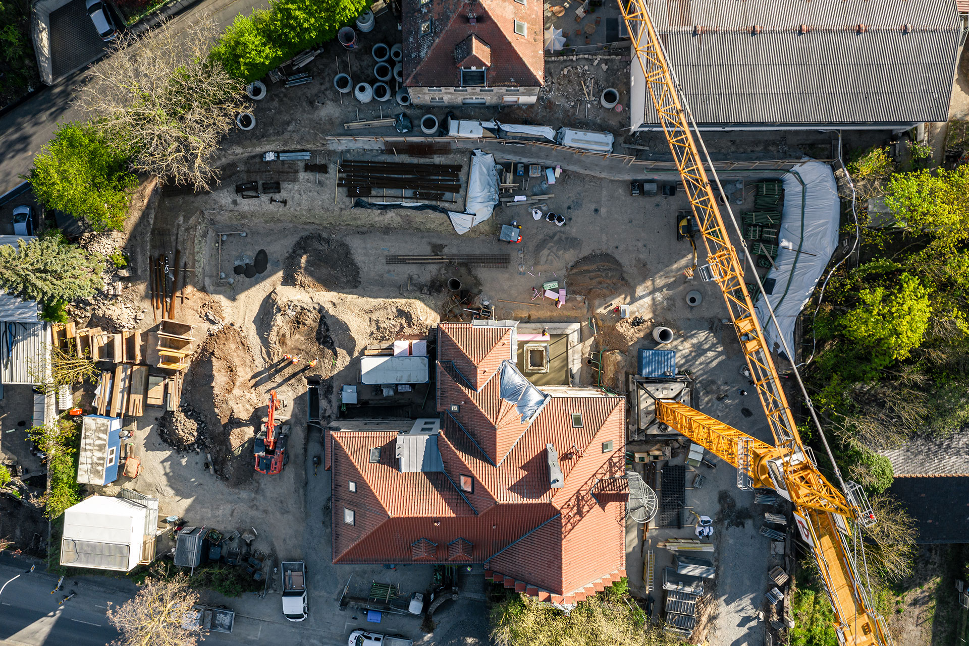 Ein anspruchsvoller, verschachtelter Baukörper, bei dem architektonisch auf die unterschiedlichen Bestandsebenen eingegangen werden muss. Eine herausfordernde Maßnahme für alle Beteiligten. Zur Unterstützung wird bei dieser Maßnahme ein großer Obendreherkran eingesetzt.