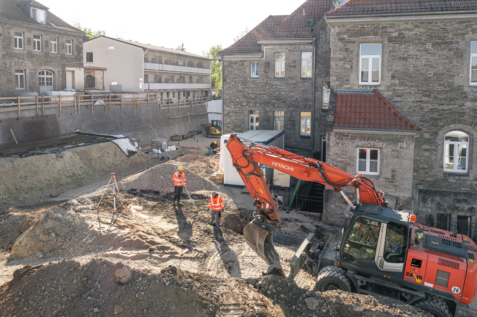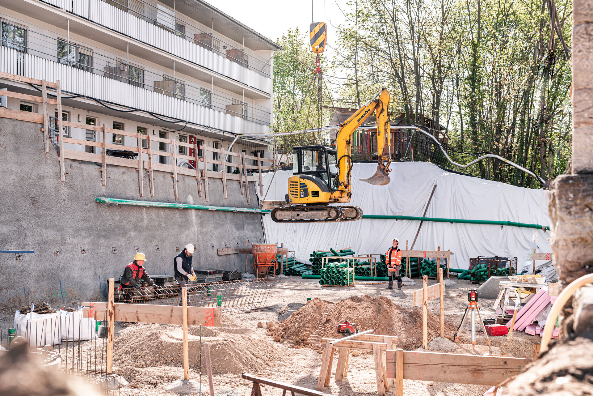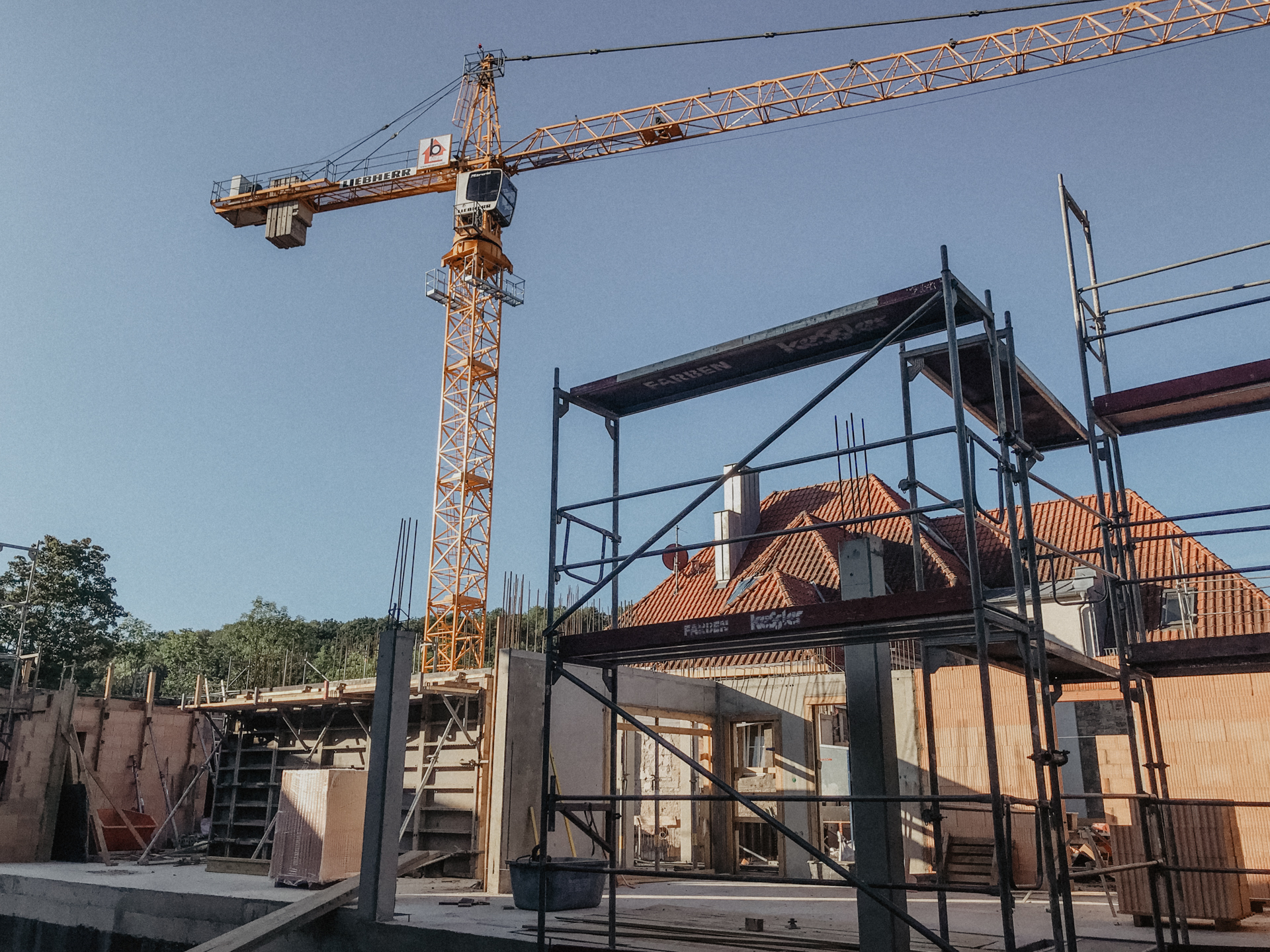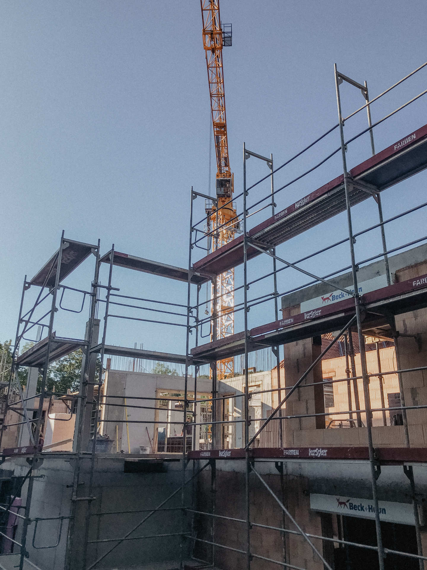 Ein anspruchsvoller, verschachtelter Baukörper, bei dem architektonisch auf die unterschiedlichen Bestandsebenen eingegangen werden muss. Eine herausfordernde Maßnahme für alle Beteiligten. Zur Unterstützung wird bei dieser Maßnahme ein großer Obendreherkran eingesetzt.