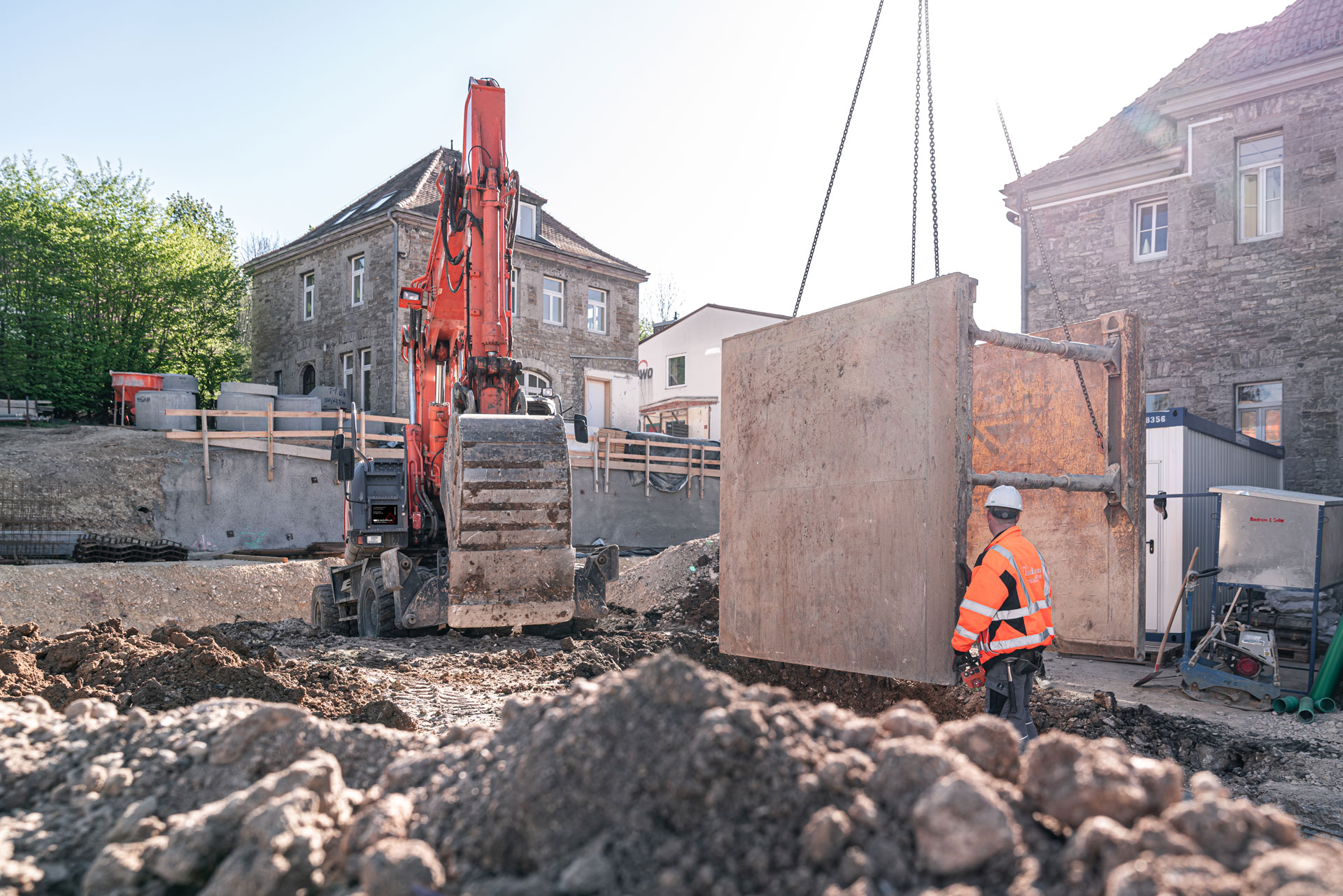 Im Jahr 2019 wurde unser großes Projekt AWO Marktbreit mit Abbrucharbeiten und Spezialtiefbauleistungen begonnen; Mitten in eine bestehenden Bebauung wird hier ein neues Wohnheim errichtet.