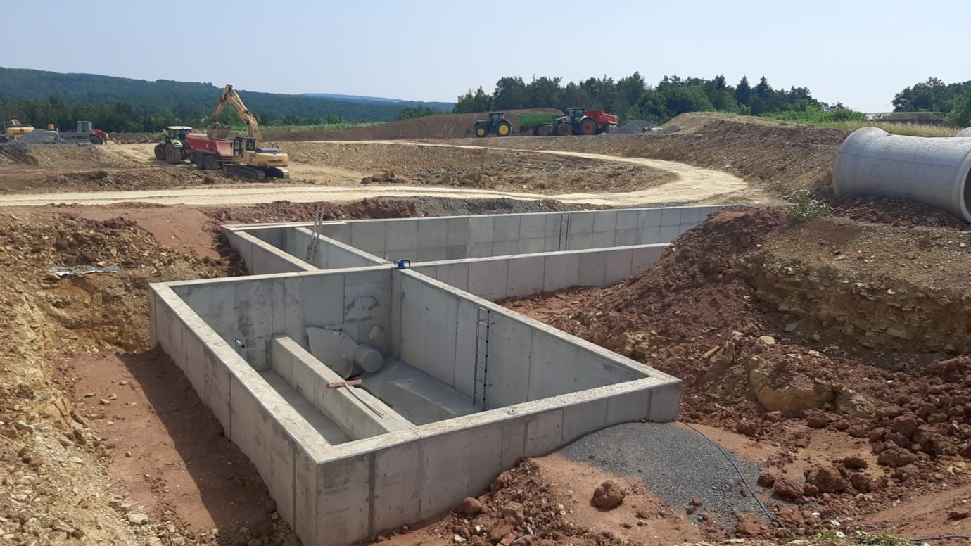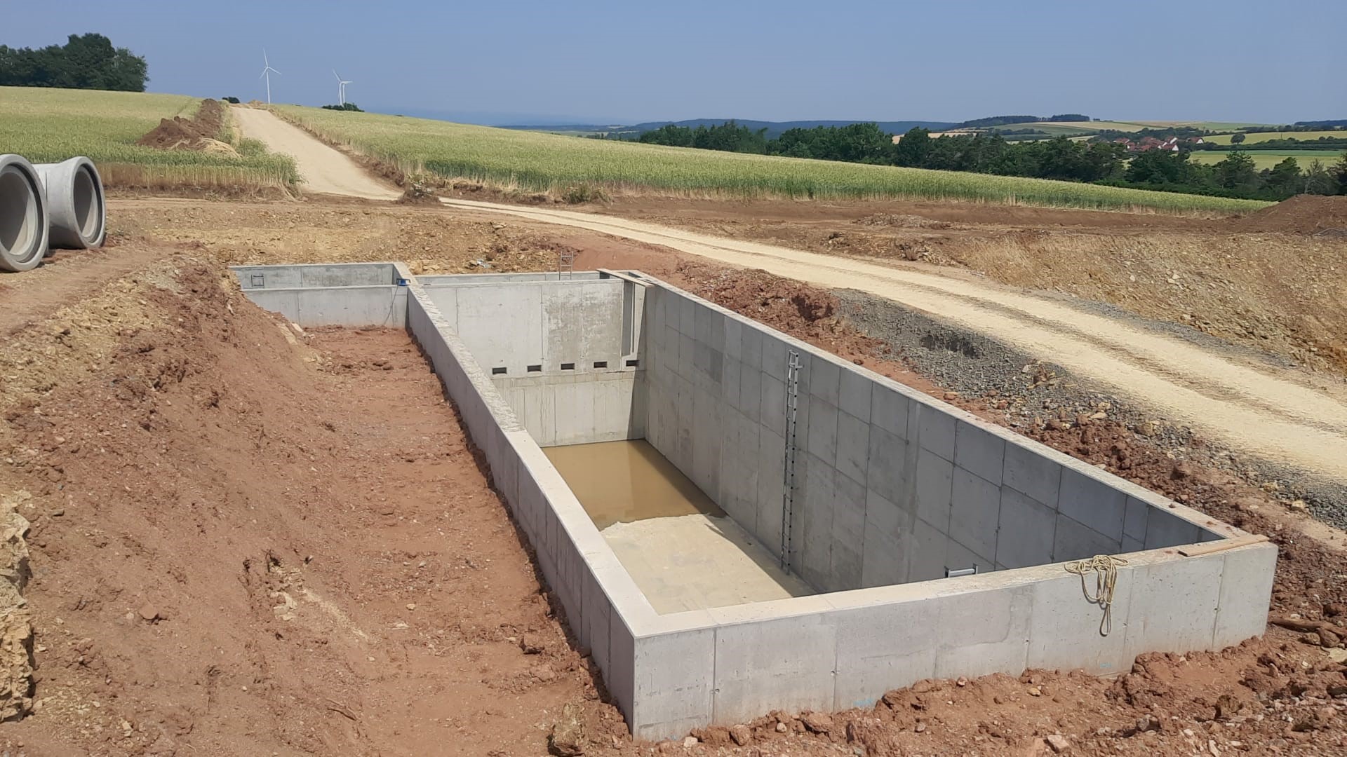Ein Hochbau im Tiefbau! Im neu entstehenden Gewerbegebiet Poppenlauer wurde zur Regenwasserbehandlung ein technisches Bauwerk notwendig.